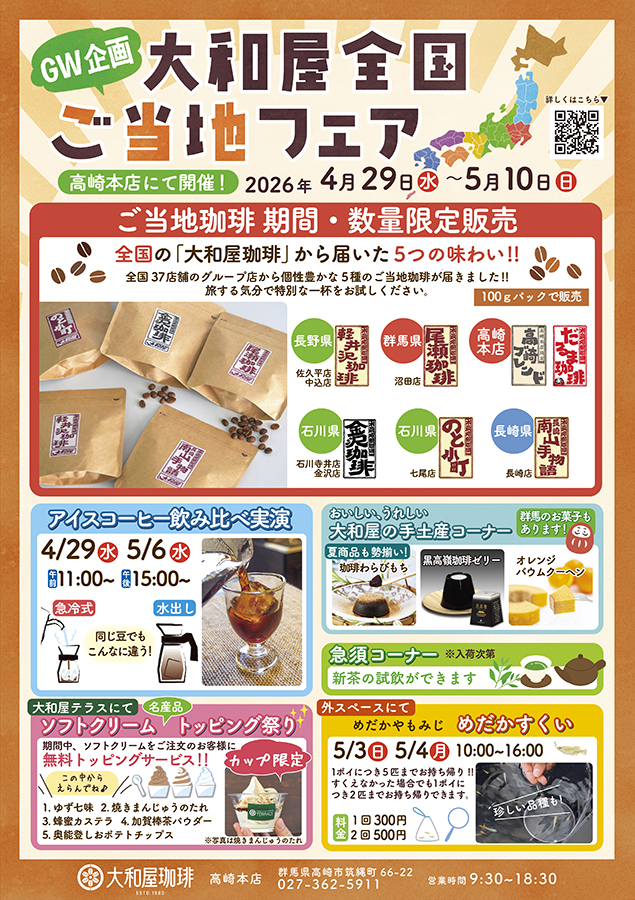 大和屋珈琲高崎本店では、4月29日(水)~5月10日(日)までの期間、全国各地の個性豊かな味わいが集結する「大和屋 全国ご当地フェア」を開催いたします!!
