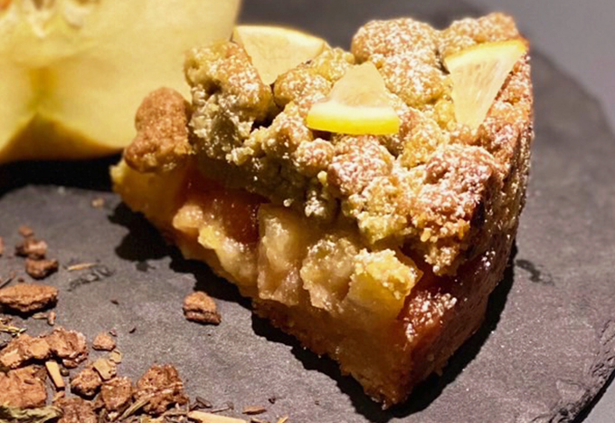 自家製アーモンドクリームとほうじ茶香るザクザク食感のクランブル、甘さを引き立てるレモンを合わせました。