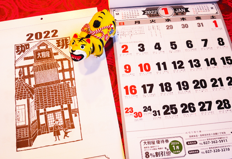 珈琲豆、珈琲ギフト、オリジナル商品、陶器が8%引きとなる優待券の付いた2022年カレンダーを先着にて配布。