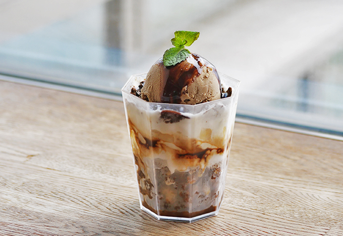 コーヒーアイスにチョコレートソース、ミルクアイスにホイップクリーム、