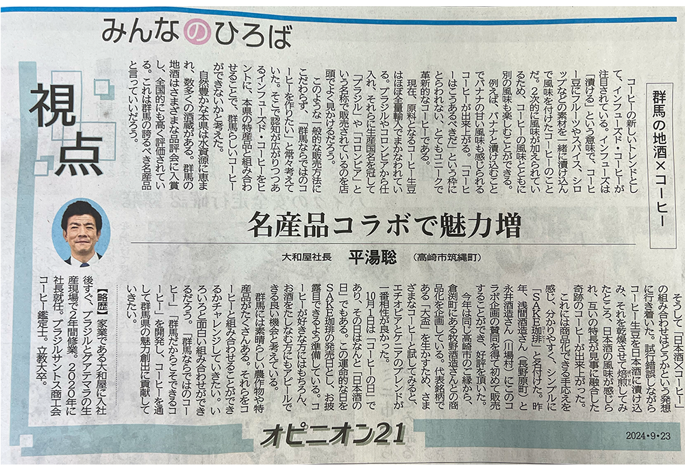 2024年9月24日 【上毛新聞】視点 オピニオン21掲載 2024年9月23日(月)上毛新聞様「視点 オピニオン21」に、大和屋社長平湯聡のコラムが掲載されました。 ぜひご一読くださいませ。 「2024年9月23日付上毛新聞」 クリックするとWEB紙面にリンクします。 « 10/4(金)開催‼️ 秋の夜長にSAKEと珈琲を楽しむ会9月は週末キッチンカー(9/28変更になりました。) »