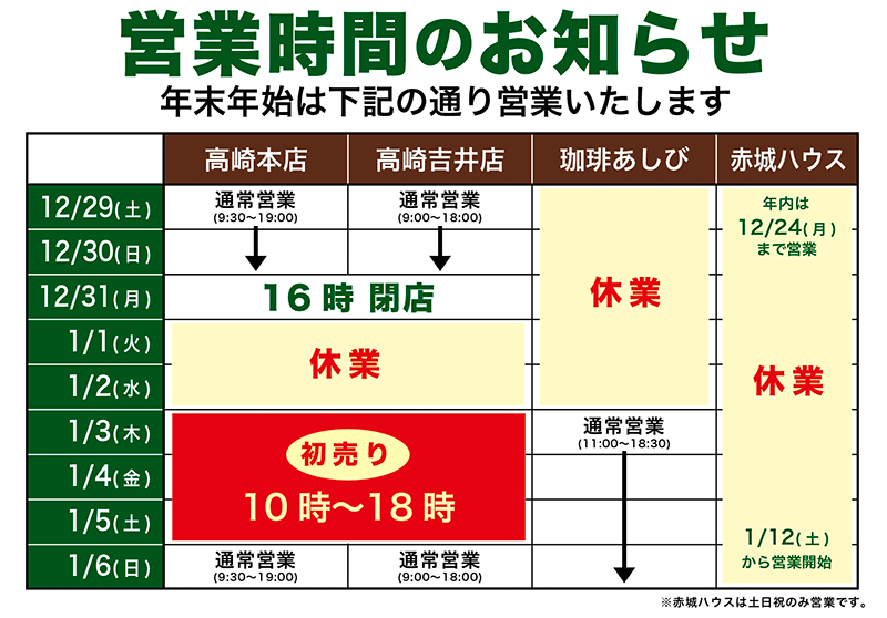 年末年始は下記通りに営業いたします。