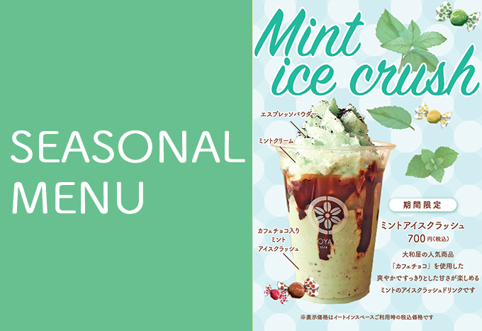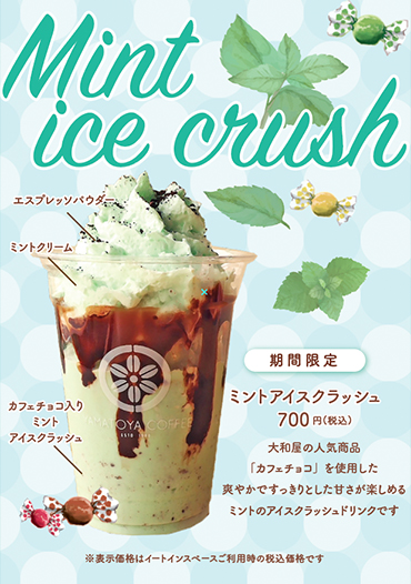 大和屋の人気商品「カフェチョコ」を使用した爽やかですっきりとした甘さが楽しめる、ミントのアイスクラッシュです。