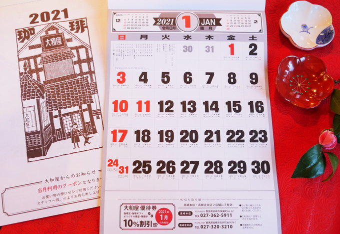 珈琲豆、珈琲ギフト、オリジナル商品、陶器が10%引きとなる優待券の付いた2021年カレンダーを先着にて配布。
