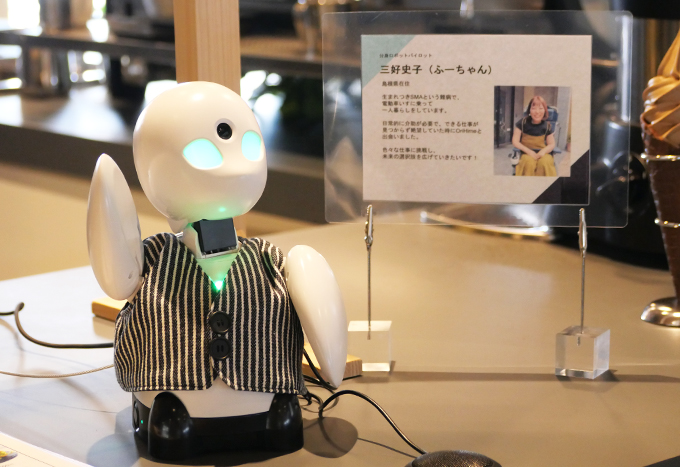 身体障害や移動に制限のある方が自宅から操作し、カメラやマイクを使い接客を行っています。