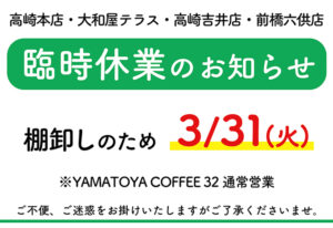 ネットショップ 店舗のお知らせ 重要なお知らせ 採用のお知らせ 全てのお知らせ 店舗 直営店 高崎本店 2026年4月1日 キッチンカーがやってくる(4/1更新) 店舗 直営店 大和屋テラス 2026年4月1日 大和屋テラス基本メニュー(4/1~) 店舗 直営店 前橋六供店 2026年3月31日 前橋六供店 カフェメニュー 店舗 直営店 高崎本店 2026年3月31日 おいしいものが大集合!フードポップアップスタンド(4/1更新) 店舗 直営店 高崎本店 2026年3月28日 4月11日(土)12日(日)開催 ミニあおぞら陶器市 店舗 直営店 YAMATOYA COFFEE 32 2026年3月18日 3月25日(水)〜期間限定!「リトリートコラボメニュー」 店舗 直営店 前橋六供店 2026年3月18日 3月25日(水)〜期間限定!「リトリートコラボメニュー」 店舗 直営店 前橋六供店 2026年3月17日 3/26 (木)四季で楽しむカリグラフィーワークショップ 店舗 直営店 高崎本店 2026年3月16日 3月22日(日)開催 春を感じるクラフトマルシェ 店舗 直営店 高崎本店 2026年3月16日 3月31日(火)棚卸しによる臨時休業のお知らせ 店舗 直営店 前橋六供店 2026年3月16日 【お知らせ】3月 Co_LABO珈琲教室 店舗 直営店 前橋六供店 2026年3月13日 3/13-15わくわくガチャ 店舗 直営店 大和屋テラス 2026年3月13日 《イベント出店》4/5本と珈琲とちょこっとオヤツな一日 店舗 直営店 前橋六供店 2026年3月13日 3月31日(火)お休みのお知らせ 店舗 直営店 大和屋テラス 2026年3月13日 3/31(火)臨時休業 店舗 直営店 高崎吉井店 2026年3月13日 3月31日(火)お休みのお知らせ 店舗 直営店 YAMATOYA COFFEE 32 2026年3月8日 ◆メニュー 一覧 店舗 直営店 前橋六供店 2026年3月5日 3/3~【新商品】クラッシュゼリーソフト 店舗 直営店 YAMATOYA COFFEE 32 2026年3月3日 3月7日(土)HANIまつり開催 店舗 直営店 前橋六供店 2026年2月28日 2/28~【新メニュー】ティラミスラテ 123次最後 お知らせ 全て ネットショップ 店舗からのお知らせ 大和屋総合 直営店 大和屋テラス YAMATOYA COFFEE 32 高崎本店 高崎吉井店 前橋六供店 グループ店 北海道/東北 栃木 群馬 埼玉 南関東 甲信越北陸 中部/近畿 九州 重要なお知らせ ネットショップ 店舗 店舗イベント 全てのイベント 直営店 大和屋テラス 高崎本店 高崎吉井店 前橋六供店 つれづれ記 全てのつれづれ記 動画 ブログ