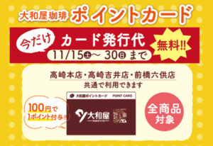 ネットショップ 店舗のお知らせ 重要なお知らせ 採用のお知らせ 全てのお知らせ 店舗 大和屋総合 2025年12月5日 12月5日(金)発売【期間限定品】新春珈琲 店舗 大和屋総合 2025年11月28日 12月1日(月)~【ポイントカード会員様限定】優待カード配布 店舗 大和屋総合 2025年11月21日 【限定品】干支の珈琲(午) 販売中 店舗 大和屋総合 2025年11月14日 《大和屋スタッフブログ》冬の贈り物・限定ギフトセット本日より発売! 店舗 大和屋総合 2025年11月13日 11月15日(土)~30日(日) ポイントカード 発行代無料キャンペーン 店舗 大和屋総合 2025年11月7日 《大和屋スタッフブログ》11月限定カフェメニュー 店舗 大和屋総合 2025年11月7日 【限定品】11月7日(金)発売 大和屋のクリスマス商品 店舗 大和屋総合 2025年11月4日 《イベント出店》11月9日(日) 第17回キングオブパスタ2025内 ドルチェ広場 店舗 大和屋総合 2025年10月31日 《大和屋スタッフブログ》新発売!グアテマラ エスペランサ農園 パカマラ 店舗 大和屋総合 2025年10月30日 10月31日(金)【新商品】グアテマラ エスペランサ農園 パカマラ発売 店舗 大和屋総合 2025年10月24日 10月24日(金)【季節限定】チョコレートバウムクーヘン発売 店舗 大和屋総合 2025年10月22日 11月1日~3日イベント出店のお知らせ 店舗 大和屋総合 2025年10月14日 12月1日(月)〜12月14日(日)「ぐんまちゃんカフェ」群馬県庁32階で開催! 店舗 大和屋総合 2025年10月10日 《大和屋スタッフブログ》 【お客様 感謝セール】いよいよ明日からスタート!直営3店舗同時開催! (10月10日更新) 店舗 大和屋総合 2025年10月1日 《直営店》10月11日(土)~13日(月・祝)お客様感謝セール 開催 店舗 大和屋総合 2025年9月12日 《大和屋スタッフブログ》 秋の作陶展 (9月12日更新) 店舗 大和屋総合 2025年9月5日 《大和屋スタッフブログ》大和屋にも秋の訪れ…(9月5日更新) 店舗 大和屋総合 2025年8月15日 【重要】コーヒー豆及び関連商品 価格改定のお知らせ 店舗 大和屋総合 2025年8月8日 【期間限定販売】8月8日(金) お月見珈琲 発売開始 店舗 大和屋総合 2025年8月5日 【8月8日(金)発売】コロンビア チロソ 前1234次最後 お知らせ 全て ネットショップ 店舗からのお知らせ 大和屋総合 直営店 高崎本店 高崎吉井店 前橋六供店 大和屋テラス YAMATOYA COFFEE 32 グループ店 群馬 埼玉 南関東 甲信越北陸 中部/近畿 九州 北海道/東北 栃木 重要なお知らせ ネットショップ 店舗 店舗イベント 全てのイベント 直営店 高崎本店 高崎吉井店 前橋六供店 大和屋テラス YAMATOYA COFFEE 32 つれづれ記 全てのつれづれ記 動画 ブログ