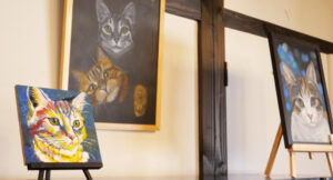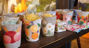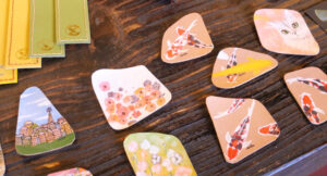 錦鯉をかぶった絵描きさん。開催期間中、お絵描き教室も行います。その他、即興でペットなどを描きます。所要時間15分~30分