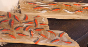 錦鯉のかぶりものをした黒板アーティスト。