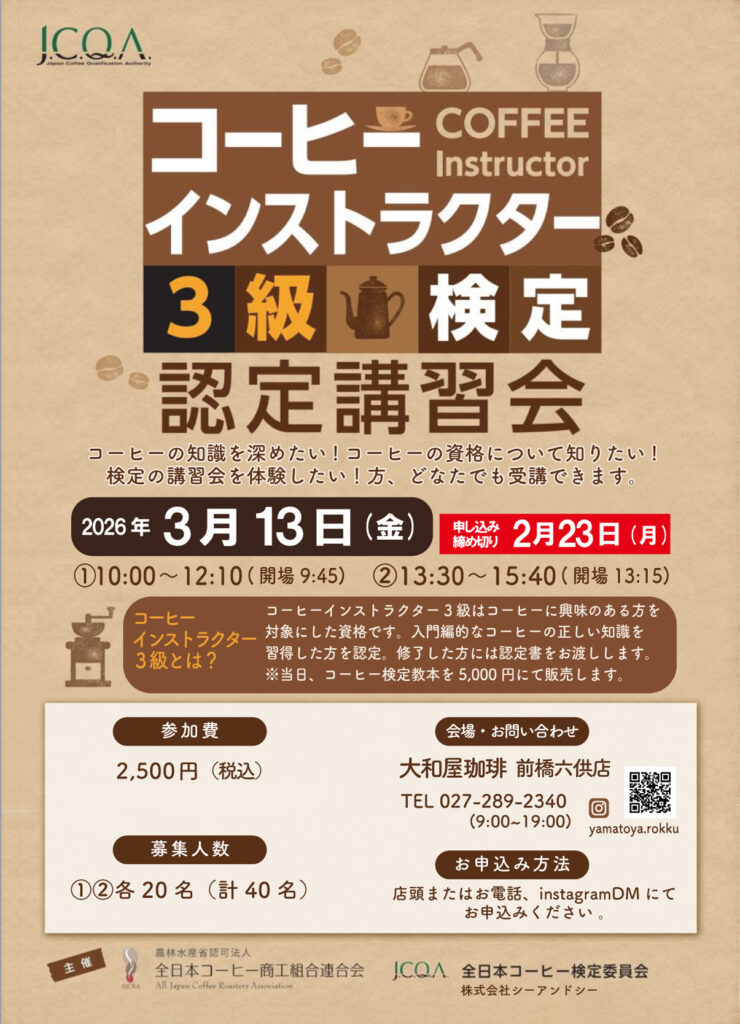 コーヒーインストラクター3級検定・認定講習会を前橋六供店にて開催いたします。