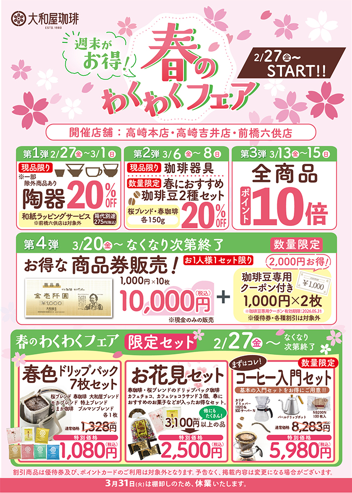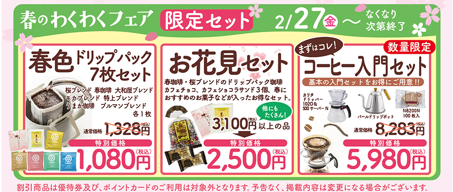 【数量限定】桜ブレンドと春珈琲 各150gのセットを20%OFFで販売!!