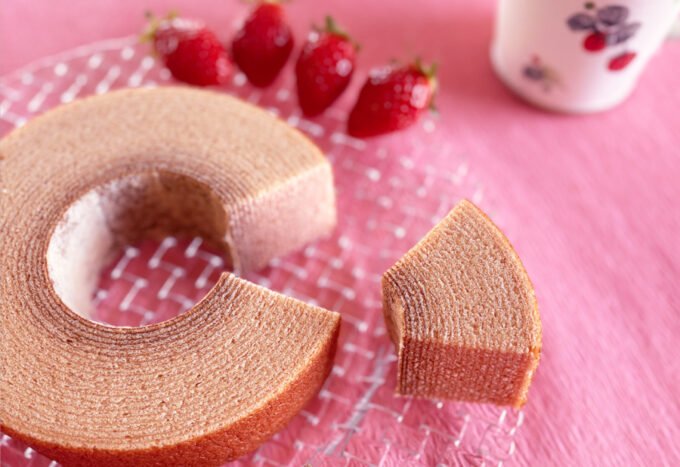 国産苺ピューレをたっぷり練り込んだやさしい甘さのバウムクーヘン。